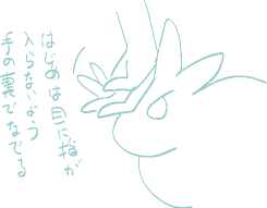 むこうから膝をつんつんとつついてきたり、顎で匂いつけをするようなら、上空からそっと手を近づけて、頭を撫でてみましょう。うさぎの目線から手を接近させると、うさぎは恐がります。あなた自身がうさぎに慣れるまでは、手の裏側、つまり甲と指の背を使って撫でることをおすすめします。こうすると、指で誤ってうさぎさんの弱点・飛び出した目をつっついたりすることもなく、安心です。
