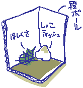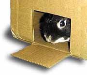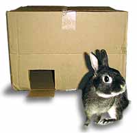 では、どうしましょう? うさぎが気に入らない家具はどけてみるとか、うさぎが安心できる場所を用意してあげます。段ボールの空箱にうさぎがギリギリ入れるくらいの穴を一個だけ開けて、部屋の隅などに置いてみましょう。「ここなら安全」という場所があるのと無いのとでは、うさぎの行動は全然ちがってきます(↓下図)。