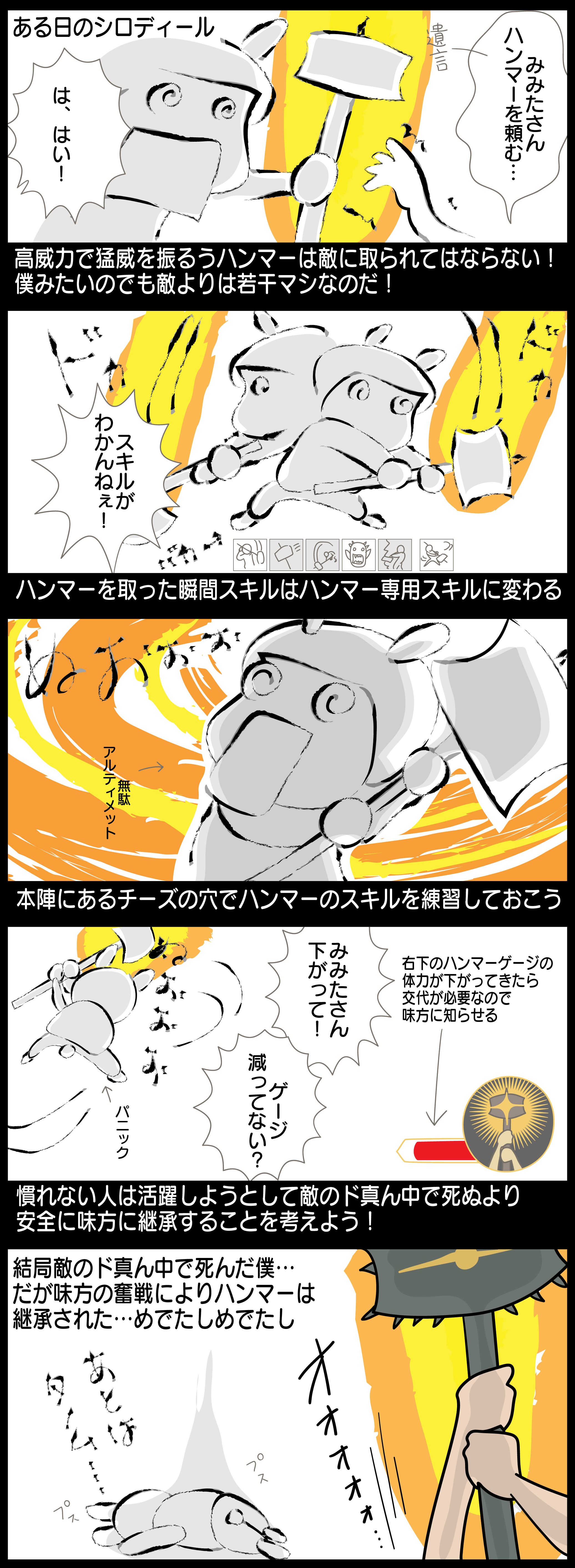 2コマ目に描いたように、ハンマーを取るとハンマー専用のスキルに切り替わります。右側の1つ(スキル5)は壁を壊すスキルだし、左から2番目、3番目(スキル2、3)はターゲットに照準が合ってないとグレーアウトしているので、普通に使えるのは左から1番目の振り回し(スキル1)と右端(アルティメットのぞく)から2番目のバフとアルティメットしかありません。人間の敵はチョロチョロ動くため安定して敵が捉えられないのでスキル2、3は群れてるところを狙わないと発動そのものもうまくできませんでした。