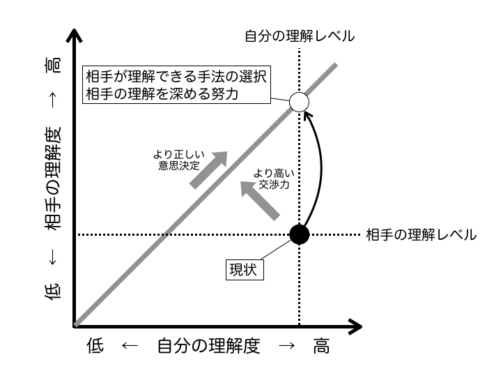 この図は,ある分析手法における自分の理解度と相手の理解度とを2軸にとった平面です.分析手法ごとにこの平面が異なることに注意してください.(この平面に分析手法がプロットされるわけではありません.)対角線上では自分と相手の理解度が釣り合うことになり,この線に近づくほどよりその分析手法は高い交渉力があるということになります.両者の理解力が釣り合うといっても,原点に近いほどお互いの理解度が低いので,より正しい意思決定のためには右上を目指すのが望ましいでしょう.(必ずしもそうとは限りませんけど.)