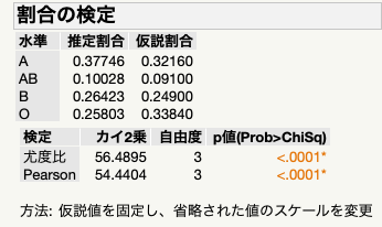 2×2以外に「Fisherの正確検定」を拡張する手法があるのですが,これはJMP Proには実装されていたように思います.(手元にJMP Proがないので記憶が定かでなく,もしかしたら間違いかもしれません.)このため,ここではB,AB,O,を非Aとまとめたのです.とにかく,このレポートに書いてある通り,<0.001で有意性ありということは確認できました.